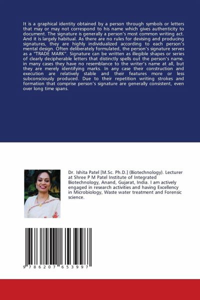 It is a graphical identity obtained by a person through symbols or letters that may or may not correspond to his name which gives authenticity to document. The signature is generally a person's most common writing act. And it is largely habitual. As there are no rules for devising and producing signatures, they are highly individualized according to each person's mental design. Often deliberately formulated, the person's signature serves as a "TRADE MARK". Signature can be written as illegible shapes or series of clearly decipherable letters that distinctly spells out the person's name. in many cases they have no resemblance to the writer's name at all, but they are merely identifying marks. In any case their construction and execution are relatively stable and their features more or less subconsciously produced. Due to their repetition writing strokes and formation that comprise person's signature are generally consistent, even over long time spans.