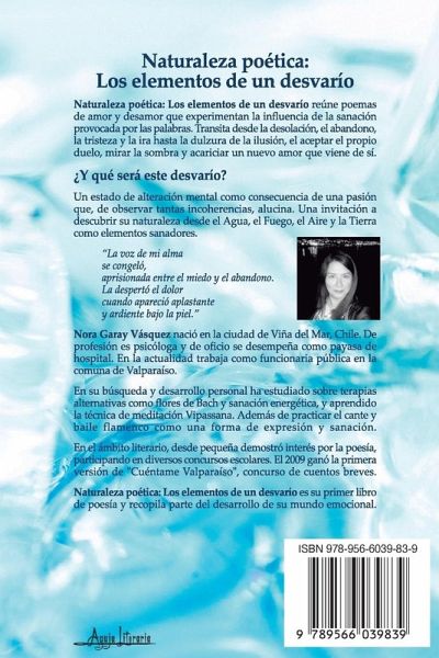 Naturaleza poética: Los elementos de un desvarío reúne poemas de amor y desamor que experimentan la influencia de la sanación provocada por las palabras. Transita desde la desolación, el abandono, la tristeza y la ira hasta la dulzura de la ilusión, aceptar el propio duelo, mirar la sombra y acariciar un nuevo amor que viene de sí. ¿Y qué será este desvarío? Un estado de alteración mental como consecuencia de una pasión que, de observar tantas incoherencias, alucina. Una invitación a descubrir su naturaleza desde el agua, el fuego, el aire y la tierra como elementos sanadores.