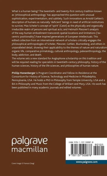 Introduction; Phillip Honenberger 1. In Pursuit of Something Essential About Man: Heidegger and Philosophical Anthropology; Beth Cykowski 2. Gehlen, Nietzsche, and the Project of a Philosophical Anthropology; Richard Schacht 3. Hans Blumenberg: Philosophical Anthropology and the Ethics of Consolation; Viva Pavesich 4. Naturalism, Pluralism, and the Human Place in the Worlds; Phillip Honenberger 5. Plessner's Conceptual Investigations of 'Life': Structural Narratology; Scott Davis 6. Gehlen's Philosophical Anthropology: Contemporary Applications in Addiction Research; Sally Wasmuth 7. The Hybrid Hominin: A Renewed Point of Departure for Philosophical Anthropology; Lenny Moss 8. Intentionality and Mentality as Explanans and as Explanandum: On Michael Tomasello's Research Program and Philosophical Anthropology; Hans-Peter Kruger 9. Biology and Culture; Joseph Margolis 10. The Mortal Self: A Transcendental-Pragmatic Anthropology; Sami Pihlstrom
