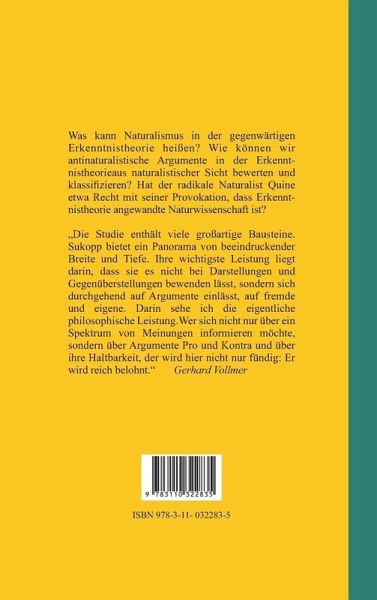 Was kann Naturalismus in der gegenwärtigen Erkenntnistheorie heißen? Wie können wir antinaturalistische Argumente in der Erkenntnistheorie aus naturalistischer Sicht bewerten und klassifizieren? Hat der radikale Naturalist Quine etwa Recht mit seiner Provokation, dass Erkenntnistheorie angewandte Naturwissenschaft ist? "Die Studie enthält viele großartige Bausteine. Sukopp bietet ein Panorama von beeindruckender Breite und Tiefe. Ihre wichtigste Leistung liegt darin, dass sie es nicht bei Darstellungen und Gegenüberstellungen bewenden lässt, sondern sich durchgehend auf Argumente einlässt, auf fremde und eigene. Darin sehe ich die eigentliche philosophische Leistung. Wer sich nicht nur über ein Spektrum von Meinungen informieren möchte, sondern über Argumente Pro und Kontra und über ihre Haltbarkeit, der wird hier nicht nur fündig: Er wird reich belohnt." Gerhard Vollmer