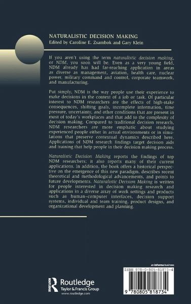 If you aren't using the term naturalistic decision making, or NDM, you soon will be. Even as a very young field, NDM has already had far-reaching applications in areas as diverse as management, aviation, health care, nuclear power, military command and control, corporate teamwork, and manufacturing. Put simply, NDM is the way people use their experience to make decisions in the context of a job or task. Of particular interest to NDM researchers are the effects of high-stake consequences, shifting goals, incomplete information, time pressure, uncertainty, and other conditions that are present in most of today's work places and that add to the complexity of decision making. Applications of NDM research findings target decision aids and training that help people in their decision-making processes. This book reports the findings of top NDM researchers, as well as many of their current applications. In addition, the book offers a historical perspective on the emergence of this new paradigm, describes recent theoretical and methodological advancements, and points to future developments. It was written for people interested in decision making research and applications relative to a diverse array of work settings and products such as human-computer interfaces, decision support systems, individual and team training, product designs, and organizational development and planning.