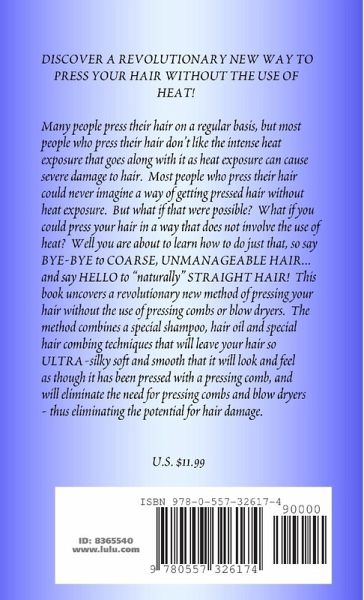 Many people press their hair regularly, but most people who press their hair don't like the intense heat exposure that goes along with it as heat exposure can cause severe damage to hair. Most people who press their hair could never imagine a way of getting pressed hair without heat exposure. But what if that were possible? What if you could press your hair in a way that does not involve the use of heat? Well you are about to learn how to do just that, so say BYE-BYE to COARSE, UNMANAGEABLE HAIR... and say HELLO to "naturally" STRAIGHT HAIR! This book uncovers a revolutionary new method of pressing your hair without the use of pressing combs or blow dryers. The method combines a special shampoo, hair oil and special hair combing techniques that will leave your hair so ultra-silky soft and smooth that it will look and feel as though it has been pressed with a pressing comb, and will eliminate the need for pressing combs and blow dryers - thus eliminating the potential for hair damage.