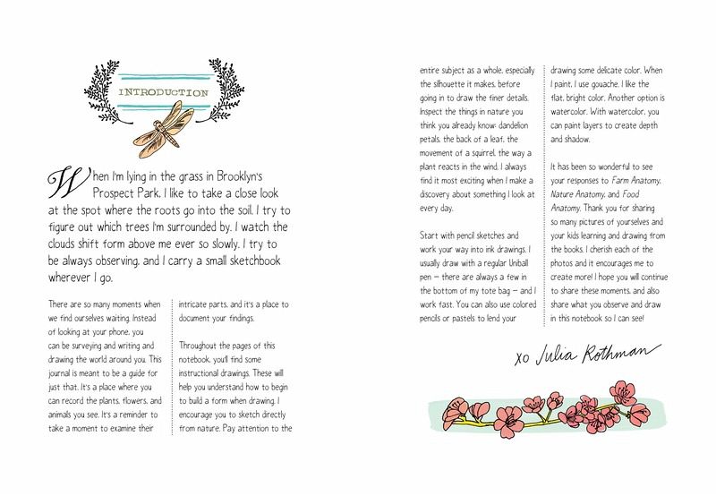 Adults and children are irresistibly drawn to Julia Rothman's best-selling illustrated guide to the natural world, Nature Anatomy, with its colorful drawings that awaken curiosity - and invite imitation. With this companion volume, Rothman leads fans deeper into nature observation with her specially designed record pages for tracking daily nature sightings throughout the seasons. Her step-by-step technique tutorials for drawing a flower, a dragonfly, a robin, and much more, along with blank sketchbook pages, will inspire nature lovers and art enthusiasts of all ages to take up their own colored pencils or favorite pens and create their own unique Nature Anatomy Notebook. Also available in Julia Rothman's Anatomy series: Ocean Anatomy, Farm Anatomy, and Food Anatomy.
