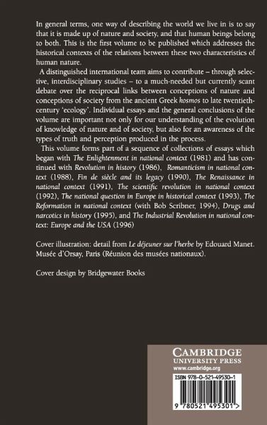 In general terms, one way of describing the world we live in is to say that it is made up of nature and society, and that human beings belong to both. A distinguished international team aims to contribute - through selective, interdisciplinary studies - to a much-needed but currently scant debate over the reciprocal links between perceptions of nature and perceptions of society from the ancient Greek kosmos to late twentieth-century 'ecology'. Individual essays and the general conclusions of the volume are important not only for our understanding of the evolution of knowledge of nature and of society but also for an awareness of the types of truth and perception produced in the process.