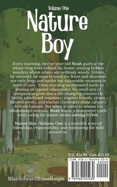 Every morning, twelve-year-old Noah presses his forehead to his bedroom window, drawn to the whispering trees beyond his backyard fence. Where others see just a patch of woods, Noah senses a world of mystery, brimming with frogs and turtles, hidden salamanders, and bright-winged butterflies. Determined to explore, he steps past the fence and discovers that the forest holds not only wonders but also vulnerable creatures in need of help. From rescuing a turtle ensnared in fishing line to nursing an injured salamander, Noah's simple acts of compassion evolve into a mission that transforms his life. As he builds a backyard vivarium-an ever-growing sanctuary for wildlife-his bond with nature deepens. Soon, he's inspiring friends, cleaning up trash-littered creeks, and teaching classmates about the delicate balance of ecosystems. But the wild cannot be tamed forever. When it comes time to let his rehabilitated animals go, Noah faces the bittersweet truth: truly caring for nature means setting it free. Filled with the quiet magic of night walks by the creek, vivid afternoons among wildflowers, and the thrill of each small discovery, Nature Boy - Volume One is a heartfelt story of friendship, responsibility, and finding one's place in the grand, ever-changing tapestry of the natural world.