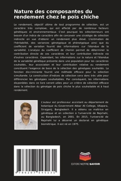 Le rendement, objectif ultime de tout programme de sélection, est un caractère très complexe, qui est affecté par de nombreux facteurs génétiques et environnementaux. C'est pourquoi les sélectionneurs ont besoin d'un indice de caractère afin de concevoir une stratégie de sélection indirecte en vue d'obtenir un rendement plus élevé. L'estimation de l'héritabilité, des variances génotypique et phénotypique ainsi que du coefficient de variation fournit des informations sur l'étendue de la variabilité. L'analyse du coefficient de chemin permet de déterminer la contribution directe de ces caractères et leur contribution indirecte via d'autres caractères. Cependant, les informations sur la nature et l'étendue de la variabilité génétique présente dans une population pour les caractères souhaités, leur association et leur contribution relative au rendement constituent l'exigence de base de la sélection des génotypes souhaités. La fonction discriminante fournit une méthode efficace pour la sélection simultanée. La construction d'indices de sélection sera donc très utile pour différencier les génotypes souhaitables. Par conséquent, les informations disponibles dans ce livre seront utiles pour un critère de sélection efficace dans la sélection du génotype de pois chiche le plus souhaitable et à haut rendement.