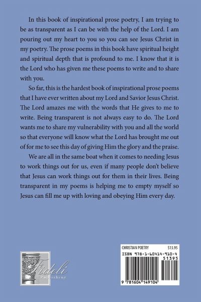 In this book of inspirational prose poetry, I am trying to be as transparent as I can be with the help of the Lord. I am pouring out my heart to you so you can see Jesus Christ in my poetry. The prose poems in this book have spiritual height and spiritual depth that is profound to me. I know that it is the Lord who has given me these poems to write and to share with you. So far, this is the hardest book of inspirational prose poems that I have ever written about my Lord and Savior Jesus Christ. The Lord amazes me with the words that He gives to me to write. Being transparent is not always easy to do. The Lord wants me to share my vulnerability with you and all the world so that everyone will know what the Lord has brought me out of for me to see this day of giving Him the glory and the praise. We are all in the same boat when it comes to needing Jesus to work things out for us, even if many people don't believe that Jesus can work things out for them in their lives. Being transparent in my poems is helping me to empty myself so Jesus can fill me up with loving and obeying Him every day.