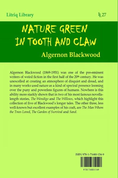 Algernon Blackwood (1869-1951) was one of the pre-eminent writers of weird fiction in the first half of the 20th century. He was unexcelled at creating an atmosphere of disquiet and dread, and in many works used nature as a kind of spectral presence looming over the puny and powerless figures of humans. Nowhere is this ability more starkly shown that in two of his most famous novella-length stories, The Wendigo and The Willows, which highlight this collection of five of Blackwood's longer tales. The other three, less well-known but excellent examples of his craft, are The Man Whom the Trees Loved, The Garden of Survival and Sand.