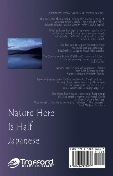 To read NATURE HERE IS HALF JAPANESE is to accompany the author on her perambulations in natural settings noticing the changes though the year. Concurrently, an empathetic reader may find it parallels in her book to ones hopefully long lived life including ones inevitable aging. If there's an unwritten message in her book it's to celebrate the seasons while you are here. You could go for a ginko, i.e. a walk in natural setting too. If it's raining or too cold to be outside; a mall could be the place for your walkabout. Wherever you are, look around and celebrate especially the small things. It could be by writing a haiku. Poets often carry notebooks to pencil in ideas that occur to them when they walk. As Michael Dylan Welch points out in the Welcome Section of Baker's book, the specific subjects of Winona Baker's observations are most often things seen in British Columbia's Pacific Northwest area. Her fondness for the southeast region of Vancouver Island, where she has lived for many years, shows up clearly in the haiku and senryu in NATURE HERE IS HALF JAPANESE, her seventh book.