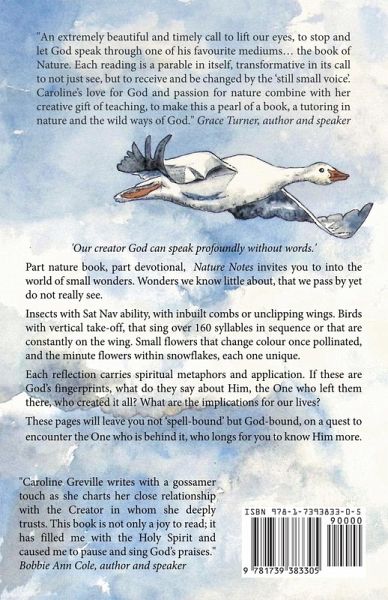 'Our creator God can speak profoundly without words.' Part nature book, part devotional, Caroline Greville's Nature Notes invites you to into the world of small wonders. Wonders we know little about, that we pass by yet do not really see. Insects with Sat Nav ability, with inbuilt combs or unclipping wings. Birds with vertical take-off, that sing over 160 syllables in sequence or that are constantly on the wing. Small flowers that change colour once pollinated, and the minute flowers within snowflakes, every one unique. Each reflection carries spiritual metaphors and application. If these are God's fingerprints, what do they say about Him, the One who left them there, who created it all? What are the implications for our lives? These pages will leave you not 'spell-bound' but God-bound, on a quest to encounter the One who is behind it, who longs for you to know Him more.