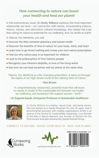 Nature, Our Medicine: How the natural world sustains us Find out how connecting to nature can boost your health and heal our planet¿¿ Join mother, nature lover and family physician, Dr Dimity Williams as she explores the most important relationship we have - our connection with nature. The natural world provides our life support system- giving us clean air and water, a stable climate and healthy soils to grow our food. Earth's biological richness, or biodiversity, offers us precious medicines and beautiful places for psychological and spiritual rejuvenation. Yet modern life has seen screen spaces replace green places as we have moved inside and into virtual worlds. This change has not been good for us, or our planet. Lifestyle-related diseases and mental health problems are overwhelming health systems everywhere. Meanwhile, outside, the natural world is falling apart with climate change and mass extinctions of plants and animals. The solution is simple: we need to reconnect to nature Incorporating science, history, stories, and alternative cultural knowledge, Dimity makes the case that caring for nature is essential for our wellbeing. And, for all life on Earth.Uncover the links between planetary and human health Discover the benefits of time in nature for your body, mind and heart Learn how to go forest bathing and create your own nature prescription Find out why nature play is so important for children Look to the philosophies of First Nations people Recognise your inherent biophilia, or love of the living world See how we can heal ourselves and our planet at the same time Praise for Nature, Our Medicine "Nature, Our Medicine is a live-changing proposition. It takes us through the rapids of our high stress world to the calming balm of nature." Bob Brown "A comprehensively researched, powerful book that will leave no reader in doubt of the inextricable link between our health, our wellbeing and humanity's life support system - Earth." Dr Eugenie Kayak, Enterprise Professor in Sustainable Healthcare "No surprise that Dr Dimity Williams brings her nurturing nature as a compassionate GP, a wonderful mother and nature lover to this honest, heartfelt and healing book. Through her scientific expertise, life experience and common sense, she doesn't sugar coat the challenges but also leaves the reader hopeful with practical solutions from making space in our lives for nature, inspiring the next generation, and even writing nature prescriptions for her patients." Dr Grant Blashki, Lead Clinical Adviser, Beyond Blue, Associate Professor in Global Health University of Melbourne About the authorDr Dimity Williams has worked as a family physician for 25 years and in environmental advocacy with multiple organisations. Dimity is an alumna of the Centre for Sustainability Leadership and founder of Doctors for the Environment Australia's Biodiversity Special Interest Group. Especially interested in how time in nature supports children's wellbeing, she is a co-founder of the Kids In Nature Network. Dimity envisions a world where all children have every opportunity to experience, love and look after nature.