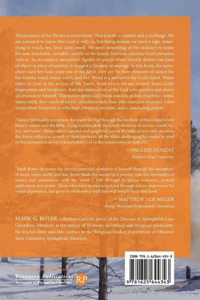 The presence of the Divine is everywhere. That is both a comfort and a challenge. We are consoled to know that God is with us, but being human we need a sign, something to touch, see, hear, taste, smell. We need something of the ordinary to name the non-touchable, invisible, unable-to-be-heard, tasteless, odorless God's presence with us. So, we employ metaphors, figures of speech which literally denote one kind of object in place of another, to suggest a likeness or analogy. In this book, the metaphors used for God come out of the Bible; they are the four elements of nature for the Greeks: wind, water, earth, and fire. Wind is a metaphor for God's Spirit. Water refers to God as the source of life. Earth, from which we are created, bears God's fingerprints and footprints. And fire reminds us of the God who purifies and draws all creation to himself. This nature spirituality book consists of four chapters--wind, water, earth, fire--each of which contains twenty, four-part exercises of prayer: a few verses from Scripture, a reflection, a journal exercise, and a concluding prayer.