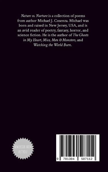Nature vs. Nurture is book by Author Michael J. Cosenza containing 132 poems. It covers various topics, such as love and life, and is written in a free verse format without punctuation.