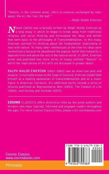 "Nature, in the common sense, refers to essences unchanged by man: space, the air, the river, the leaf." -Ralph Waldo Emerson Nature (1836) was originally written by Ralph Waldo Emerson as a long essay in which he began to break away from traditional religious and social thinking and formulated the ideas and beliefs that were basic to the philosophy of Transcendentalism. In this essay, Emerson outlined his thinking about the fundamental relationship of man with nature. To many other intellectuals at the time his ideas were revolutionary because he abandoned the popular belief that humanity is…mehr