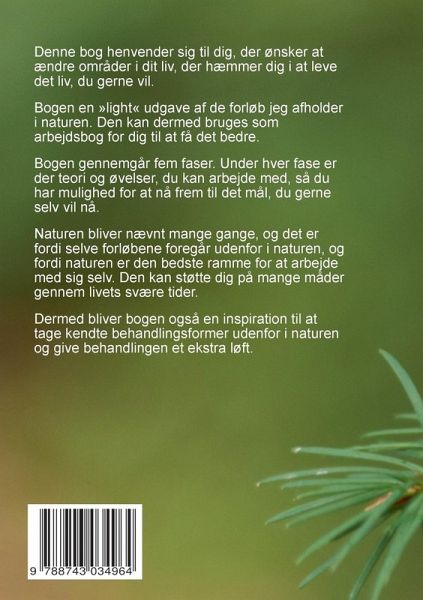 Denne bog henvender sig til dig, der ønsker at ændre områder i dit liv, der hæmmer dig i at leve det liv, du gerne vil. Bogen en »light« udgave af de forløb jeg afholder i naturen. Den kan dermed bruges som arbejdsbog for dig til at få det bedre. Bogen gennemgår fem faser. Under hver fase er der teori og øvelser, du kan arbejde med, så du har mulighed for at nå frem til det mål, du gerne selv vil nå. Naturen bliver nævnt mange gange, og det er fordi selve forløbene foregår udenfor i naturen, og fordi naturen er den bedste ramme for at arbejde med sig selv. Den kan støtte dig på mange måder gennem livets svære tider. Dermed bliver bogen også en inspiration til at tage kendte behandlingsformer udenfor i naturen og give behandlingen et ekstra løft.