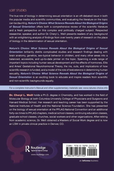 The true role of biology in determining sexual orientation is an oft-debated issue in both the popular media and scientific communities, and evaluating the literature on the topic can be daunting. Nature's Choice: What Science Reveals About the Biological Origins of Sexual Orientation offers both a comprehensive review of the scientific literature and a fresh perspective on this complex and politically charged subject. Respected researcher, speaker, and author Dr. Cheryl Weill offers readers of all backgrounds an enlightening analysis of findings from over twenty years of research on the factor of biology in the determination of sexual orientation. Nature's Choice: What Science Reveals About the Biological Origins of Sexual Orientation brilliantly distills complicated studies and research findings dealing with brain anatomy, genetics, sex-typical behavior in children, auditory, startle reflex, and many other areas. Spanning a wide range of important topics including human sexual development and the effects of hormones, Ellis and Ames' Gestational Neurohormonal Theory, the ins, outs, and implications of how scientific research is funded, and model of the role of testosterone in determining human sexuality, Nature's Choice: What Science Reveals About the Biological Origins of Sexual Orientation is an exciting book to educate and inspire readers from scientific and non-scientific backgrounds equally.
