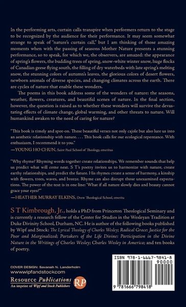 In the performing arts, curtain calls transpire when performers return to the stage to be recognized by the audience for their performance. It may seem somewhat strange to speak of ""nature's curtain call,"" but I am thinking of those amazing moments when with the passing of seasons Mother Nature presents a stunning performance, so to speak, for which we, the observers, are amazed: the appearance of spring's flowers, the budding trees of spring, snow-white winter snow, huge flocks of Canadian geese flying south, the filling of dry waterbeds with late spring's melting snow, the stunning colors of autumn's leaves, the glorious colors of desert flowers, newborn animals of diverse species, and changing climates across the earth. There are cycles of nature that enable these wonders. The poems in this book address some of the wonders of nature: the seasons, weather, flowers, creatures, and beautiful scenes of nature. In the final section, however, the question is raised as to whether these wonders will survive the devastating effects of climate change, global warming, and other threats to nature. Will humankind awaken to the need of caring for nature?