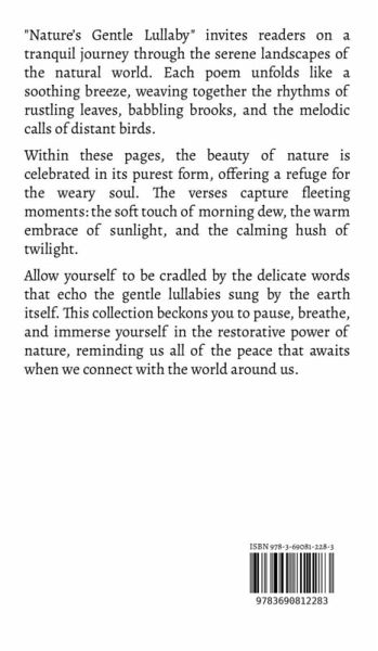 "Nature's Gentle Lullaby" invites readers on a tranquil journey through the serene landscapes of the natural world. Each poem unfolds like a soothing breeze, weaving together the rhythms of rustling leaves, babbling brooks, and the melodic calls of distant birds. Within these pages, the beauty of nature is celebrated in its purest form, offering a refuge for the weary soul. The verses capture fleeting moments: the soft touch of morning dew, the warm embrace of sunlight, and the calming hush of twilight. Allow yourself to be cradled by the delicate words that echo the gentle lullabies sung by the earth itself. This collection beckons you to pause, breathe, and immerse yourself in the restorative power of nature, reminding us all of the peace that awaits when we connect with the world around us.