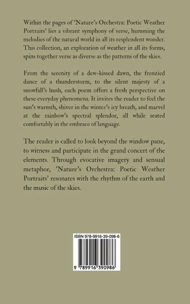Within the pages of 'Nature's Orchestra: Poetic Weather Portraits' lies a vibrant symphony of verse, humming the melodies of the natural world in all its resplendent wonder. This collection, an exploration of weather in all its forms, spins together verse as diverse as the patterns of the skies.From the serenity of a dew-kissed dawn, the frenzied dance of a thunderstorm, to the silent majesty of a snowfall's hush, each poem offers a fresh perspective on these everyday phenomena. It invites the reader to feel the sun's warmth, shiver in the winter's icy breath, and marvel at the rainbow's spectral splendor, all while seated comfortably in the embrace of language.The reader is called to look beyond the window pane, to witness and participate in the grand concert of the elements. Through evocative imagery and sensual metaphor, 'Nature's Orchestra: Poetic Weather Portraits' resonates with the rhythm of the earth and the music of the skies.