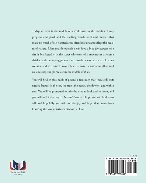 Today, we exist in the middle of a world torn by the ravishes of war, progress, and greed and the resulting wood, steel, and mortar that make up much of our habited areas often hide or camouflage the beauty of nature. Momentarily outside a window, a blue jay appears or a city is blanketed with the super whiteness of a snowstorm or even a child sees the annoying presence of a roach or mouse across a kitchen counter, and we pause to remember that natures' voices are all around us, and surprisingly, we are in the middle of it all. You will find in this book of poems a reminder that there still exits natural beauty in the sky, the trees, the ocean, the flowers, and within you. You will be prompted to take the time to look and to listen, and you will find its beauty. In Nature's Voices, I hope you will find yourself, and hopefully, you will find the joy and hope that comes from knowing the love of nature's creator . . . God.