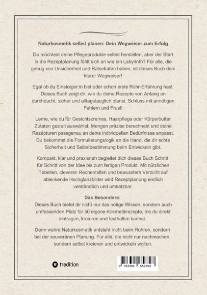 Naturkosmetik selbst planen: Dein Wegweiser zum ErfolgDu möchtest deine Pflegeprodukte selbst herstellen, aber der Start in die Rezeptplanung fühlt sich an wie ein Labyrinth? Für alle, die genug von Unsicherheit und Rätselraten haben, ist dieses Buch dein klarer Wegweiser!Egal ob du Einsteiger:in bist oder schon erste Rühr-Erfahrung hast: Dieses Buch zeigt dir, wie du deine Rezepte von Anfang an durchdacht, sicher und alltagstauglich planst. Schluss mit unnötigen Fehlern und Frust!Lerne, wie du für Gesichtscremes, Haarpflege oder Körperbutter Zutaten gezielt auswählst, Mengen präzise berechnest und deine Rezepturen passgenau an deine individuellen Bedürfnisse anpasst. Du bekommst die Formulierungslogik an die Hand, die dir echte Sicherheit und Selbstbestimmung beim Entwickeln gibt.Kompakt, klar und praxisnah begleitet dich dieses Buch Schritt für Schritt von der Idee bis zum fertigen Produkt. Mit nützlichenTabellen, cleveren Rechenhilfen und bewusstem Verzicht auf ablenkende Hochglanzbilder wird Rezeptplanung endlich verständlich und umsetzbar.Das Besondere: Dieses Buch bietet dir nicht nur das nötige Wissen, sondern auch umfassenden Platz für 50 eigene Kosmetikrezepte, die du direkt eintragen, kreieren und festhalten kannst. Denn wahre Naturkosmetik entsteht nicht beim Rühren, sondern bei der souveränen Planung. Für alle, die nicht nur nachmachen, sondern selbst kreieren und entwickeln wollen.