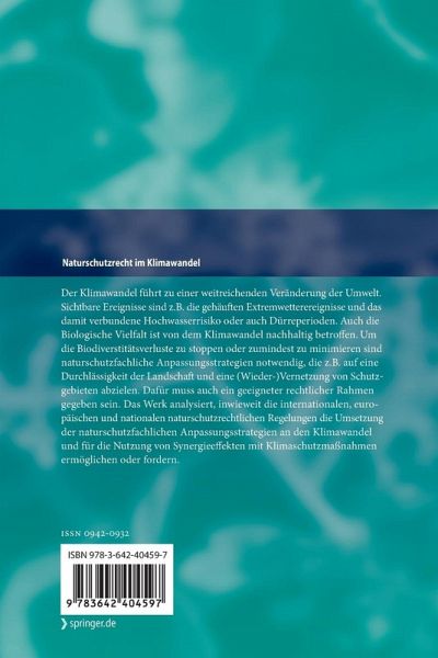 Das Werk analysiert, inwieweit die internationalen, europäischen und nationalen naturschutzrechtlichen Regelungen die Umsetzung der naturschutzfachlichen Anpassungsstrategien an den Klimawandel und für die Nutzung von Synergieeffekten mit Klimaschutzmaßnahmen ermöglichen oder fordern.