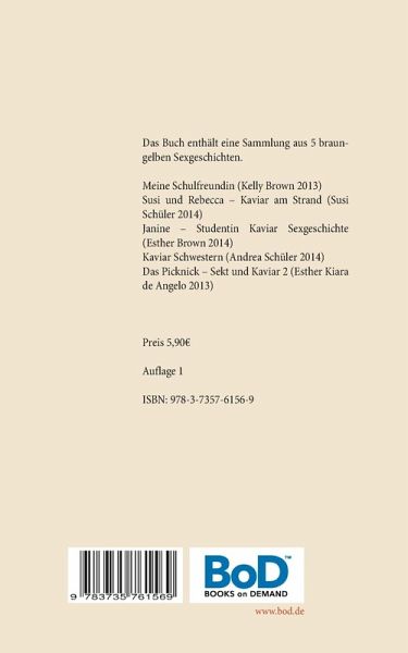 Das Buch enthält eine Sammlung aus 5 braun-gelben Sexgeschichten.Meine Schulfreundin (Kelly Brown 2013)Susi und Rebecca - Kaviar am Strand (Susi Schüler 2014)Janine - Studentin Kaviar Sexgeschichte (Esther Brown 2014)Kaviar Schwestern (Andrea Schüler 2014)Das Picknick - Sekt und Kaviar 2 (Esther Kiara de Angelo 2013)