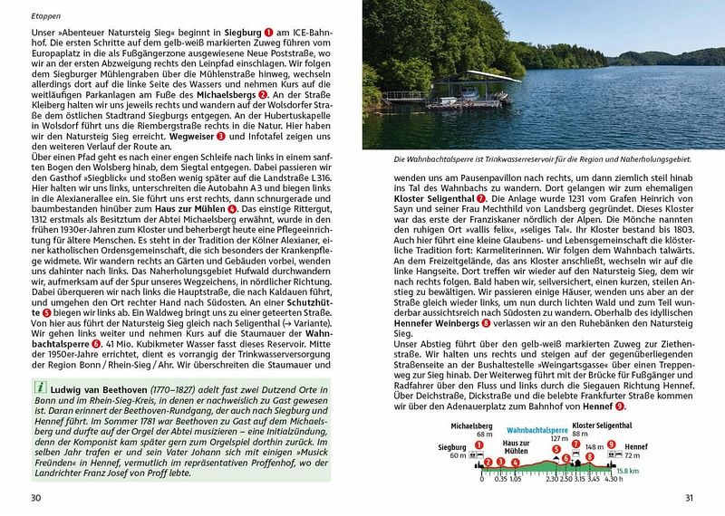 Jede Etappe des Natursteigs Sieg wird mit einer zuverlässigen Wegbeschreibung, einem aussagekräftigen Höhenprofil und einem Tourenkärtchen mit eingetragenem Routenverlauf vorgestellt. GPS-Tracks stehen zum Download bereit. Alle wichtigen Informationen zu Übernachtung, Einkehr und Verpflegung, Länge, Anforderung, Wegvarianten und vielem mehr sind übersichtlich aufgeführt. Informativ sind die Stadtporträts von Siegburg und Siegen sowie Tipps zu besonderen Sehenswürdigkeiten.