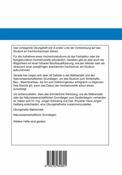 Das vorliegende Übungsheft soll in erster Linie der Vorbereitung auf das Studium an Fachhochschulen dienen. Für die Aufnahme eines Hochschulstudiums ist das Fachabitur oder die fachgebundene Hochschulreife erforderlich. Daneben gibt es aber auch die Möglichkeit mit einer höheren Berufsqualifizierung, wie den Meister oder als Absolvent einer zweijährigen anerkannten Fachschule, ein Studium aufzunehmen.Gerade hier zeigen sich aber oft Defizite in der Mathematik und den Naturwissenschaftlichen Grundlagen, um das Studium zum Wirtschafts-, Bau-, Maschinenbau- bis hin zum Elektroingenieur erfolgreich zu beginnen. Das Gleiche gilt, wenn das Datum der Hochschulreife schon etwas zurückliegt.Um sicherzustellen, dass das erforderliche Werkzeug, wie die Mathematik oder die Naturwissenschaftlichen Grundlagen zum Studienbeginn vorhanden ist, haben sich Dr.-Ing. Jürgen Schlüsing und Dipl.-Physiker Hans-Jürgen Hellberg entschieden, eine Übungsheftreihe zusammenzustellen.Übungshefte Mathematik Naturwissenschaftliche Grundlagen. Weitere Hefte sind geplant.