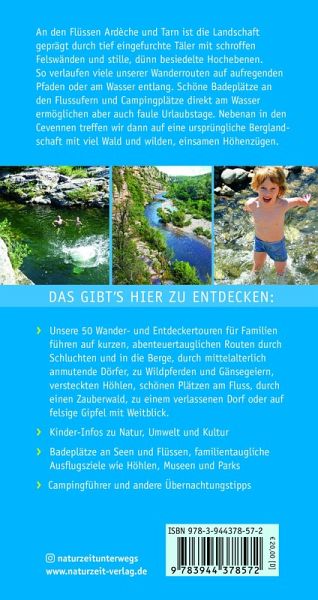 An den Flüssen Ardèche und Tarn ist die Landschaft geprägt durch tief eingefurchte Täler mit schroffen Felswänden und stille, dünn besiedelte Hochebenen. So verlaufen viele unserer Wanderrouten auf aufregenden Pfaden oder am Wasser entlang. Schöne Badeplätze an den Flussufern und Campingplätze direkt am Wasser ermöglichen aber auch faule Urlaubstage. Nebenan in den Cevennen treffen wir dann auf eine ursprüngliche Berglandschaft mit viel Wald und wilden, einsamen Höhenzügen.Das gibt's hier zu entdecken:' Auf kurzen, abenteuertauglichen Routen wandern wir durch Schluchten und in die Berge, durch mittelalterlich anmutende Dörfer, zu Wildpferden und Gänsegeiern, versteckten Höhlen, schönen Plätzen am Fluss, durch einen Zauberwald, zu einem verlassenen Dorf oder auf felsige Gipfel mit Weitblick.' Kinder-Infos zu Natur, Umwelt und Kultur' Badeplätze an Seen und Flüssen, familientaugliche Ausflugsziele wie Höhlen, Museen und Parks' Campingführer und andere Übernachtungstipps