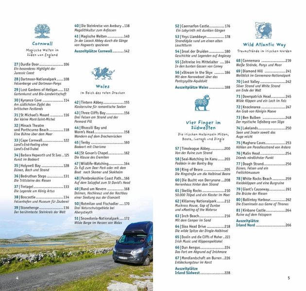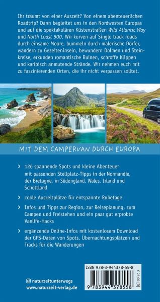 Ihr träumt von einer Auszeit? Von einem abenteuerlichen Roadtrip? Dann begleitet uns in den Nordwesten Europas und auf die spektakulären Küstenstraßen Wild Atlantic Way und North Coast 500. Wir kurven auf Single track roads durch einsame Moore, bummeln durch malerische Dörfer, wandern zu Gezeiteninseln, bewundern Dolmen und Steinkreise, erkunden romantische Ruinen, schroffe Klippen und karibisch anmutende Strände. Wir nehmen euch mit zu faszinierenden Orten, die ihr nicht verpassen solltet. - 126 spannende Spots und kleine Abenteuer mit passenden Stellplatz-Tipps in der Normandie, der Bretagne, in Südengland, Wales, Irland und Schottland - coole Auszeitplätze für entspannte Ruhetage - Infos und Tipps zur Region, zur Reiseplanung, zum Campen und Freistehen und ein paar gut erprobte Vanlife-Hacks - ergänzende Online-Infos mit kostenlosem Download der GPS-Daten von Spots, Übernachtungsplätzen und Tracks für Wanderungen
