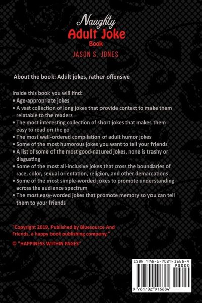 #NSFW Make Sure No One Is Watching Behind You! Q: Why was Jesus not born Indian? A: There couldn't be found a virgin or three wise men. A little laughter goes a long way and certainly, Naughty Adult Joke Book #5: Dirty, Funny And Slutty Jokes That Exploded The Indian Call Centre, will take you to a great length. It is certainly one of the richest collections of naughty jokes for the adult audience. The book's chapters sort the jokes by their lengths. Of the two chapters, one is a compilation of some of the funniest short jokes, and the other is a collection of extremely hilarious long jokes, each with its unique setting. Naughty jokes are appropriate for adults; they just require the right setting. You may not be found telling these jokes at a religious function, but at a social event with friends, the jokes in this book will be the highlight of the evening. Many people find it difficult to start a conversation, and good jokes can kickstart a lively conversation. Those who like to be the life of the party get their material from content as interesting as that presented in this book. Ever wondered how some people can keep an audience for the entire day or the evening? While a number are naturally humorous, others get their material from books like this one. Reading jokes works like reading any other kind of literature; the more you read, the more you shape your mind to think in that direction. Therefore, if you train your mind to notice the queer and the funny in various situations, then you will do so even in other unrelated situations. Suddenly, your life and your way of thinking will become more positive. To that end, it is hoped that this book will be the light that lights up your path because it will be creating a jolly mood on the inside, change how you perceive situations, and even change how you relate with others. You will become good at initiating conversations and a fun person that people will constantly look forward to speaking with. You will also teach others around you to initiate the change that you have just initiated. Overall, reading these jokes is certainly going to make you feel better and in control of what happens in and around you. Act now by reading this special book today and begin the movement that turns around the lives of people with humor! Inside this book you will find: · Age-appropriate jokes · A vast collection of long jokes that provide context to make them relatable to the readers · The most interesting collection of short jokes that makes them easy to read on the go · The most well-ordered compilation of adult humor jokes · Some of the most humorous jokes you want to tell your friends · A list of some of the most good-natured jokes, none is trashy or disgusting · Some of the most all-inclusive jokes that cross the boundaries of race, color, sexual orientation, religion, and, other demarcations · Some of the most simple-worded jokes to promote understanding across the audience spectrum · The most easy-worded jokes that promote memory, so you can tell them to your friends Start Cumming Laughing Today By Clicking The "BUY NOW" Button