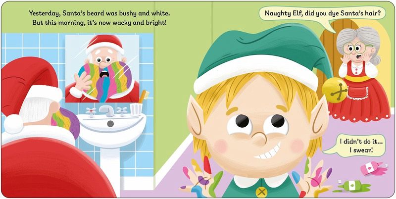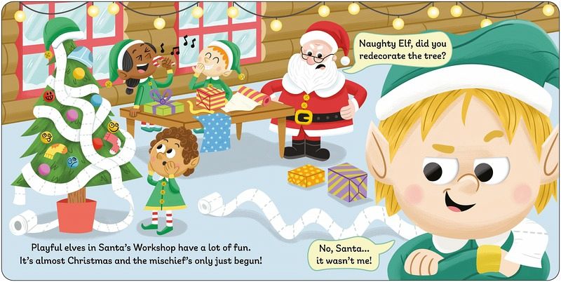 Fans of Elf on the Shelf will love this laugh-out-loud, googly-eyed board book which is completely plastic-free. A playful elf is making mischief all around Santa's workshop: redecorating the Christmas tree with toilet paper, dyeing Santa's beard, wrapping the reindeer and more. Toddlers will enjoy pushing and shaking the card googly eyes throughout the book to change Naughty Elf's expression and join in the festive fun! With funny scenes and hilarious illustrations, this book will make children giggle this Christmas.
