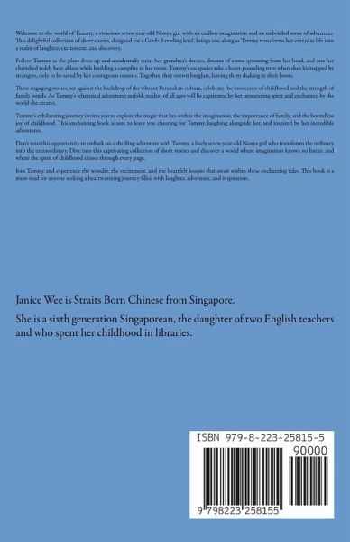 Welcome to the world of Tammy, a vivacious seven-year-old Nonya girl with an endless imagination and an unbridled sense of adventure. This delightful collection of short stories, designed for a Grade 3 reading level, brings you along as Tammy transforms her everyday life into a realm of laughter, excitement, and discovery. Follow Tammy as she plays dress-up and accidentally ruins her grandma's dresses, dreams of a tree sprouting from her head, and sets her cherished teddy bear ablaze while building a campfire in her room. Tammy's escapades take a heart-pounding turn when she's kidnapped by strangers, only to be saved by her courageous cousins. Together, they outwit burglars, leaving them shaking in their boots. These engaging stories, set against the backdrop of the vibrant Peranakan culture, celebrate the innocence of childhood and the strength of family bonds. As Tammy's whimsical adventures unfold, readers of all ages will be captivated by her unwavering spirit and enchanted by the world she creates. Tammy's exhilarating journey invites you to explore the magic that lies within the imagination, the importance of family, and the boundless joy of childhood. This enchanting book is sure to leave you cheering for Tammy, laughing alongside her, and inspired by her incredible adventures. Don't miss this opportunity to embark on a thrilling adventure with Tammy, a lively seven-year-old Nonya girl who transforms the ordinary into the extraordinary. Dive into this captivating collection of short stories and discover a world where imagination knows no limits, and where the spirit of childhood shines through every page. Join Tammy and experience the wonder, the excitement, and the heartfelt lessons that await within these enchanting tales. This book is a must-read for anyone seeking a heartwarming journey filled with laughter, adventure, and inspiration.