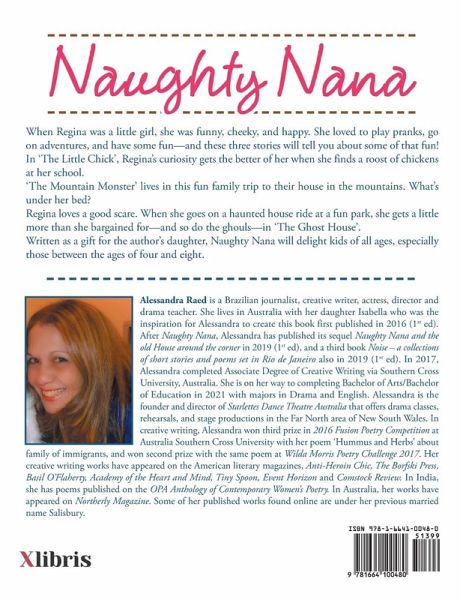 Alessandra Raed is a Brazilian journalist, creative writer, actress, director and drama teacher. She lives in Australia with her daughter Isabella who was the inspiration for Alessandra to create this book first published in 2016 (1st ed). After Naughty Nana, Alessandra has published its sequel Naughty Nana and the old House around the corner in 2019 (1st ed), and a third book Noise - a collections of short stories and poems set in Rio de Janeiro also in 2019 (1st ed). In 2017, Alessandra completed Associate Degree of Creative Writing via Southern Cross University, Australia. She is on her way to completing Bachelor of Arts/Bachelor of Education in 2021 with majors in Drama and English. Alessandra is the founder and director of Starlettes Dance Theatre Australia that offers drama classes, rehearsals, and stage productions in the Far North area of New South Wales. In creative writing, Alessandra won third prize in 2016 Fusion Poetry Competition at Australia Southern Cross University with her poem 'Hummus and Herbs' about family of immigrants, and won second prize with the same poem at Wilda Morris Poetry Challenge 2017. Her creative writing works have appeared on the American literary magazines, Anti-Heroin Chic, The Borfski Press, Basil O'Flaherty, Academy of the Heart and Mind, Tiny Spoon, Event Horizon and Comstock Review. In India, she has poems published on the OPA Anthology of Contemporary Women's Poetry. In Australia, her works have appeared on Northerly Magazine. Some of her published works found online are under her previous married name Salisbury.