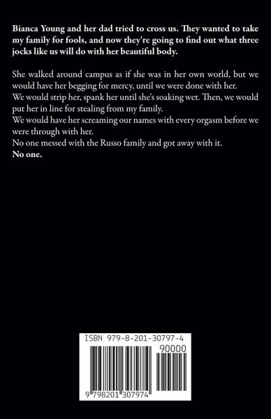 Bianca Young and her dad tried to cross us. They wanted to take my family for fools, and now they're going to find out what three jocks like us will do with her beautiful body. She walked around campus as if she was in her own world, but we would have her begging for mercy, until we were done with her. We would strip her, spank her until she's soaking wet. Then, we would put her in line for stealing from my family. We would have her screaming our names with every orgasm before we were through with her. No one messed with the Russo family and got away with it. No one.