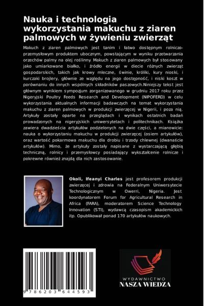 Makuch z ziaren palmowych jest tanim i ¿atwo dost¿pnym rolniczo-przemys¿owym produktem ubocznym, powstaj¿cym w wyniku przetwarzania orzechów palmy na olej ro¿linny. Makuch z ziaren palmowych by¿ stosowany jako umiarkowane biäko, i ¿ród¿o energii w diecie ró¿nych zwierz¿t gospodarskich, takich jak krowy mleczne, ¿winie, króliki, kury nioski, i kurczaki brojlery, g¿ównie ze wzgl¿du na jego dost¿pno¿¿, i niski koszt w porównaniu do innych wspólnych sk¿adników paszowych.Niniejszy tekst jest g¿ównym wynikiem sympozjum zorganizowanego w grudniu 2017 roku przez Nigeryjski Poultry Feeds Research and Development (NIPOFERD) w celu wykorzystania aktualnych informacji badawczych na temat wykorzystania makuchu z ziaren palmowych w produkcji zwierz¿cej w Nigerii, i poza ni¿. Artyku¿y zostäy oparte na przegl¿dach i wynikach ostatnich badä prowadzonych na nigeryjskich uniwersytetach i politechnikach. Ksi¿¿ka zawiera dwadzie¿cia artyku¿ów podzielonych na dwie cz¿¿ci, a mianowicie: nauka o wykorzystaniu makuchu w produkcji zwierz¿cej (osiem artyku¿ów), oraz warto¿¿ pokarmowa makuchu dla drobiu i trzody chlewnej (dwanäcie artyku¿ów). Mimo, ¿e artyku¿y zostäy napisane z wystarczaj¿c¿ g¿¿bi¿ techniczn¿, rolnicy i przemys¿owcy posiadaj¿cy wyksztäcenie rolnicze i pokrewne równie¿ znajd¿ dla nich zastosowanie.