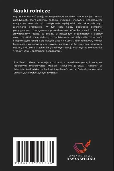 Aby zminimalizowä presj¿ na eksploatacj¿ zasobów, potrzebna jest zmiana paradygmatu, która obejmuje badania, wyzwania i innowacje technologiczne maj¿ce na celu nie tylko zwi¿kszenie wydajno¿ci, ale tak¿e ochron¿ i zachowanie ¿rodowiska. W tym celu nale¿y podkre¿li¿ ochronne, partycypacyjne i zintegrowane prawodawstwo, które ¿¿czy nauki rolnicze i zrównowäony rozwój. W zwi¿zku z powy¿szym organizatorzy i autorzy niniejszej ksi¿¿ki maj¿ nadziej¿, ¿e opublikowane rozdziäy dostarcz¿ cennych i inspiruj¿cych refleksji dla nowych badä na temat nauk rolniczych, nowych technologii i zrównowäonego rozwoju, poniewä s¿ to wzajemnie powi¿zane obszary o du¿ym znaczeniu dla globalnego rozwoju opartego na równowadze ¿rodowiskowej, spo¿ecznej i gospodarczej.