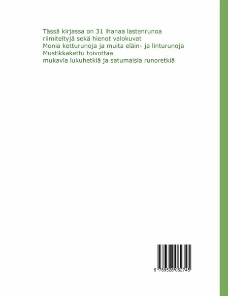 Tässä kirjassa on 31 ihanaa lastenrunoa riimiteltyjä sekä hienot valokuvat Monia ketturunoja ja muita eläin- ja linturunoja Mustikkakettu toivottaa mukavia lukuhetkiä ja satumaisia runoretkiä
