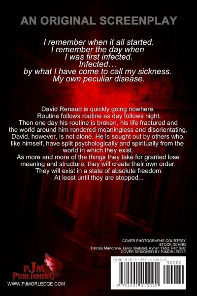 PJM Publishing present an original screenplay by Phillip J. Morledge. David Renaud is quickly going nowhere. Routine follows routine as day follows night. Then one day his routine is broken, his life fractured and the world around him rendered meaningless and disorientating. David, however, is not alone. He is sought out by others who, like himself, have split psychologically and spiritually from the world in which they exist. As more and more of the things they take for granted lose meaning and structure, they will create their own order. They will exist in a state of absolute freedom. At least until they are stopped...