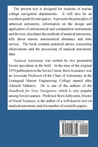 The present text is designed for students of marine college navigation departments. It will also be an excellent guide for navigators. It presents the principles of spherical astronomy, information on the design and application of astronomical and computation instruments and devices, elucidates the methods of nautical astronomy, tells about marine astronomical almanacs and time service. The book contains practical advice concerning observations and the processing of nautical astronomy data. Nautical Astronomy was written by two prominent Soviet specialists in the field. At the time of the original 1970 publication in the Soviet Union, Boris Krasatsev was an Associate Professor of the Chair of Astronomy at the Leningrad Marine Engineering College named after Admiral Makarov. He is one of the authors of the Handbook for Navy Navigators, which is very popular among Soviet seamen. Professor Boris Khlyustin, Doctor of Naval Sciences, is the author of a well-known text on nautical astronomy and of a number of scientific papers.