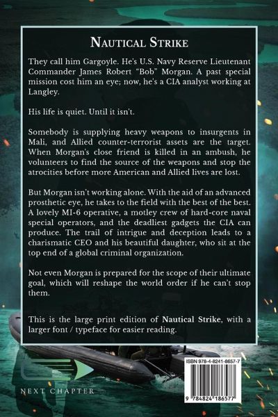 They call him Gargoyle. He's U.S. Navy Reserve Lieutenant Commander James Robert "Bob" Morgan. A past special mission cost him an eye; now, he's a CIA analyst working at Langley. His life is quiet. Until it isn't. Somebody is supplying heavy weapons to insurgents in Mali, and Allied counter-terrorist assets are the target. When Morgan's close friend is killed in an ambush, he volunteers to find the source of the weapons and stop the atrocities before more American and Allied lives are lost. But Morgan isn't working alone. With the aid of an advanced prosthetic eye, he takes to the field with the best of the best. A lovely MI-6 operative, a motley crew of hard-core naval special operators, and the deadliest gadgets the CIA can produce. The trail of intrigue and deception leads to a charismatic CEO and his beautiful daughter, who sit at the top end of a global criminal organization. Not even Morgan is prepared for the scope of their ultimate goal, which will reshape the world order if he can't stop them. This is the large print edition of Nautical Strike, with a larger font / typeface for easier reading.