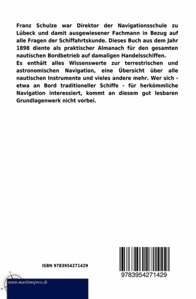 Franz Schulze war Direktor der Navigationsschule zu Lübeck und damit ausgewiesener Fachmann in Bezug auf alle Fragen der Schiffahrtskunde. Dieses Buch aus dem Jahr 1898 diente als praktischer Almanach für den gesamten nautischen Bordbetrieb auf damaligen Handelsschiffen. Es enthält alles Wissenswerte zur terrestrischen und astronomischen Navigation, eine Übersicht über alle nautischen Instrumente und vieles andere mehr. Wer sich - etwa an Bord traditioneller Schiffe - für herkömmliche Navigation interessiert, kommt an diesem gut lesbaren Grundlagenwerk nicht vorbei.
