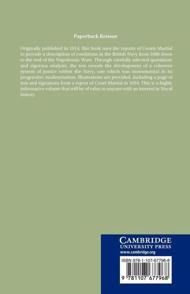 Originally published in 1914, this book uses the reports of Courts Martial to provide a description of conditions in the British Navy from 1680 down to the end of the Napoleonic Wars. Through carefully selected quotations and rigorous analysis, the text reveals the development of a coherent system of justice within the Navy, one which was instrumental in its progressive modernization. Illustrations are provided, including a page of text and signatures from a report of Court Martial in 1694. This is a highly informative volume that will be of value to anyone with an interest in naval history.