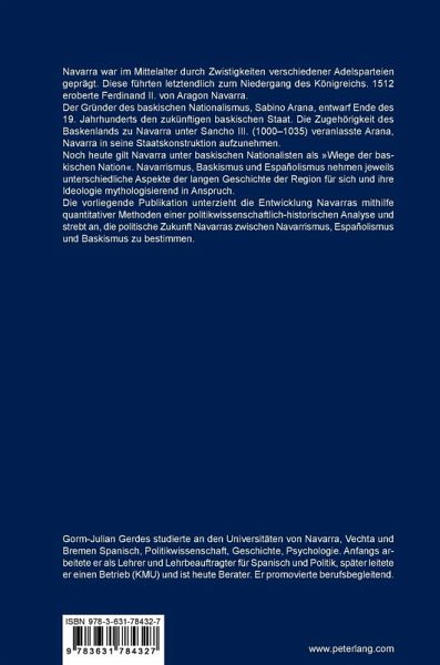 Navarra war im Mittelalter durch Zwistigkeiten verschiedener Adelsparteien geprägt. Diese führten letztendlich zum Niedergang des Königreichs. 1512 eroberte Ferdinand II. von Aragon Navarra. Der Gründer des baskischen Nationalismus, Sabino Arana, entwarf Ende des 19. Jahrhunderts den zukünftigen baskischen Staat. Die Zugehörigkeit des Baskenlands zu Navarra unter Sancho III. (1000-1035) veranlasste Arana, Navarra in seine Staatskonstruktion aufzunehmen. Noch heute gilt Navarra unter baskischen Nationalisten als »Wiege der baskischen Nation«. Navarrismus, Baskismus und Españolismus nehmen jeweils unterschiedliche Aspekte der langen Geschichte der Region für sich und ihre Ideologie mythologisierend in Anspruch. Die vorliegende Publikation unterzieht die Entwicklung Navarras mithilfe quantitativer Methoden einer politikwissenschaftlich-historischen Analyse und strebt an, die politische Zukunft Navarras zwischen Navarrismus, Españolismus und Baskismus zu bestimmen.