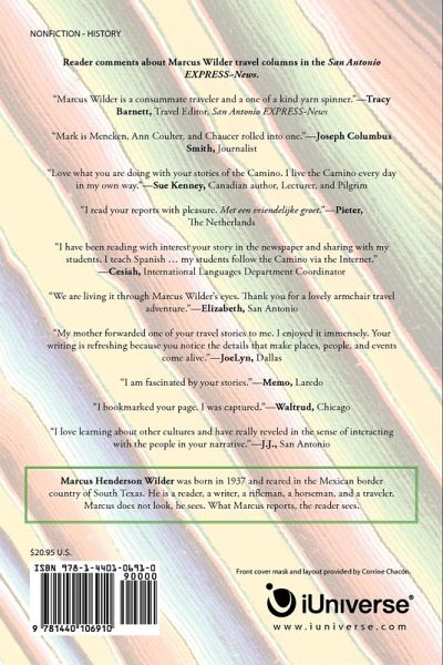 Reader comments about Marcus Wilder travel columns in the San Antonio EXPRESS~News. "Marcus Wilder is a consummate traveler and a one of a kind yarn spinner."-Tracy Barnett, Travel Editor, San Antonio EXPRESS-News "Mark is Mencken, Ann Coulter, and Chaucer rolled into one."-Joseph Columbus Smith, Journalist "Love what you are doing with your stories of the Camino. I live the Camino every day in my own way."-Sue Kenney, Canadian author, Lecturer, and Pilgrim "I read your reports with pleasure. Met een vriendelijke groet."-Pieter, The Netherlands "I have been reading with interest your story in the newspaper and sharing with my students. I teach Spanish ... my students follow the Camino via the Internet." -Cesiah, International Languages Department Coordinator "We are living it through Marcus Wilder's eyes. Thank you for a lovely armchair travel adventure."-Elizabeth, San Antonio "My mother forwarded one of your travel stories to me. I enjoyed it immensely. Your writing is refreshing because you notice the details that make places, people, and events come alive."-JoeLyn, Dallas "I am fascinated by your stories."-Memo, Laredo "I bookmarked your page. I was captured."-Waltrud, Chicago "I love learning about other cultures and have really reveled in the sense of interacting with the people in your narrative."-J.J., San Antonio