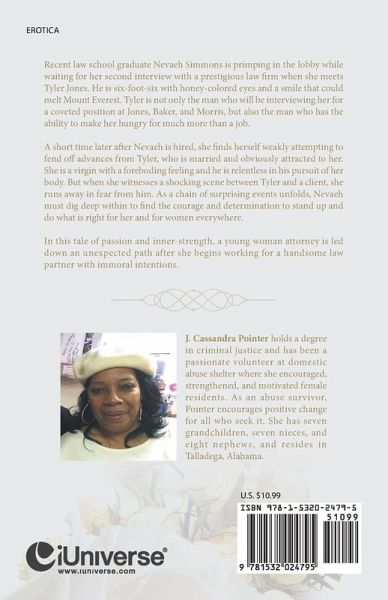 Recent law school graduate Nevaeh Simmons is primping in the lobby while waiting for her second interview with a prestigious law firm when she meets Tyler Jones. He is six-foot-six with honey-colored eyes and a smile that could melt Mount Everest. Tyler is not only the man who will be interviewing her for a coveted position at Jones, Baker, and Morris, but also the man who has the ability to make her hungry for much more than a job. A short time later after Nevaeh is hired, she finds herself weakly attempting to fend off advances from Tyler, who is married and obviously attracted to her. She is a virgin with a foreboding feeling and he is relentless in his pursuit of her body. But when she witnesses a shocking scene between Tyler and a client, she runs away in fear from him. As a chain of surprising events unfolds, Nevaeh must dig deep within to find the courage and determination to stand up and do what is right for her and for women everywhere. In this tale of passion and inner-strength, a young woman attorney is led down an unexpected path after she begins working for a handsome law partner with immoral intentions.