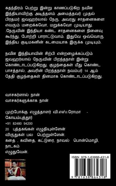Cutantiram peṟṟu iṉṟu kāṇappaṭukiṟa navīṉa intiyāviṟku aṭittaḷam amaittavar mutal piratamar javaharlāl nēru. Avaratu cātaṉaikaḷai evarum maṟaikkavō, maṟukkavō muṭiyātu. .Nēruviṉ intiyā kaṇṭa cātaṉaikaḷai niṉaivu kūrntu, pōṟṟi pārāṭṭuvām. Ituvē ovvoru intiya kuṭimakaṉiṉ kaṭamaiyāka irukka muṭiyum. Navīṉa intiyāviṉ ciṟpi eṉṟaḻaikkappaṭum javaharlāl nēruviṉ piṟantanāḷ iṉṟu koṇṭāṭappaṭukiṟatu. Kuḻantaikaḷ mītu koṇṭa pācattāl, avariṉ piṟantanāḷ navampar 14 ām tēti kuḻantaikaḷ tiṉamāka koṇṭāṭappaṭukiṟatu.