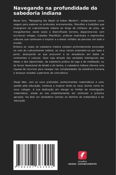 Neste livro, "Navigating the Depth of Indian Wisdom", embarcamos numa viagem para explorar os profundos ensinamentos, filosofias e tradições que emergiram do subcontinente indiano ao longo de milhares de anos. Ao mergulharmos neste vasto e diversificado terreno, deparamo-nos com escrituras antigas, tratados filosóficos, práticas espirituais e expressões culturais que continuam a inspirar e a elevar milhões de pessoas em todo o mundo.Embora as raízes da sabedoria indiana estejam profundamente ancoradas no solo do subcontinente indiano, os seus ramos estendem-se por toda a parte, alcançando os que procuram e os estudiosos em todos os continentes e culturas. Quer seja através das verdades intemporais dos Vedas e dos Upanishads, da sabedoria prática do ioga e da meditação, ou do fervor devocional do bhakti e do tantra, a sabedoria indiana oferece uma riqueza de recursos para navegar nas complexidades da existência humana e alcançar estados superiores de consciência.