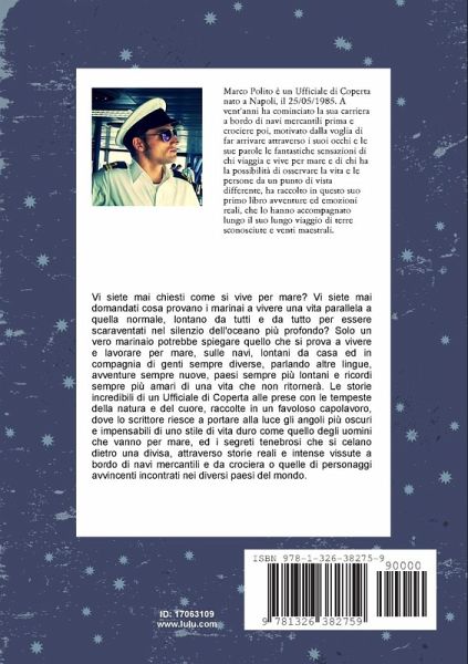 Vi siete mai chiesti come si vive per mare? Vi siete mai domandati cosa provano i marinai a vivere una vita parallela a quella normale, lontano da tutti e da tutto per essere scaraventati nel silenzio dell'oceano più profondo? Solo un vero marinaio potrebbe spiegare quello che si prova a vivere e lavorare per mare, sulle navi, lontani da casa ed in compagnia di genti sempre diverse, parlando altre lingue, avventure sempre nuove, paesi sempre più lontani e ricordi sempre più amari di una vita che non ritornerà. Le storie incredibili di un Ufficiale di Coperta alle prese con le tempeste della natura e del cuore, raccolte in un favoloso capolavoro, dove lo scrittore riesce a portare alla luce gli angoli più oscuri e impensabili di uno stile di vita duro come quello degli uomini che vanno per mare, ed i segreti tenebrosi che si celano dietro una divisa, attraverso storie reali e intense vissute a bordo di navi mercantili e da crociera o quelle di personaggi avvincenti incontrati nei diversi paesi del mondo.